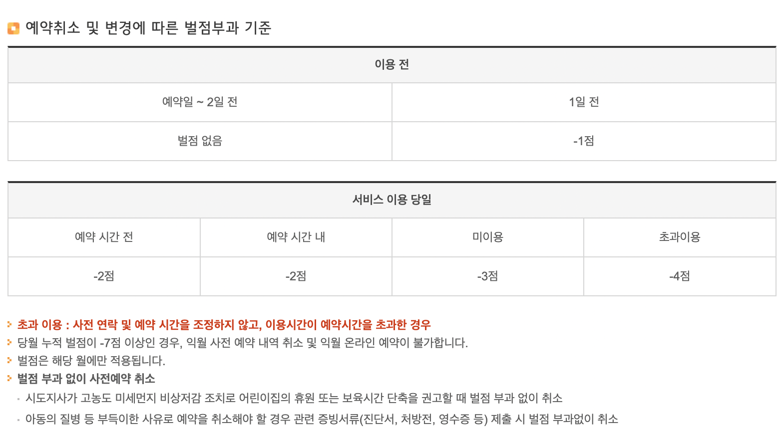 예약 취소 시 벌점 부과 기준을 유의하시고 -7점 이상인 경우 당월 사전 예약 내역 취소 및 당월 온라인 예약이 불가합니다.